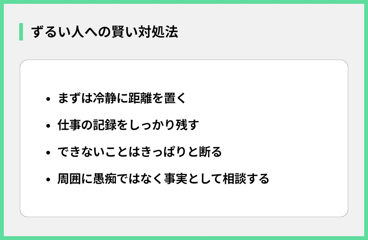 ここでは、ずるい人への賢い対処法について、以下の通り解説します。
