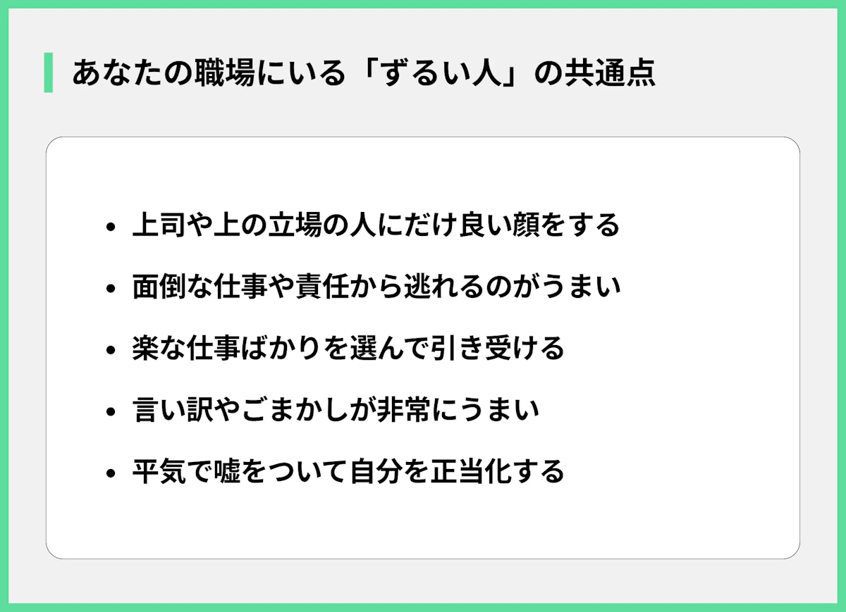 ここでは、ずるい人によく見られる共通点について、以下の通り解説します。
