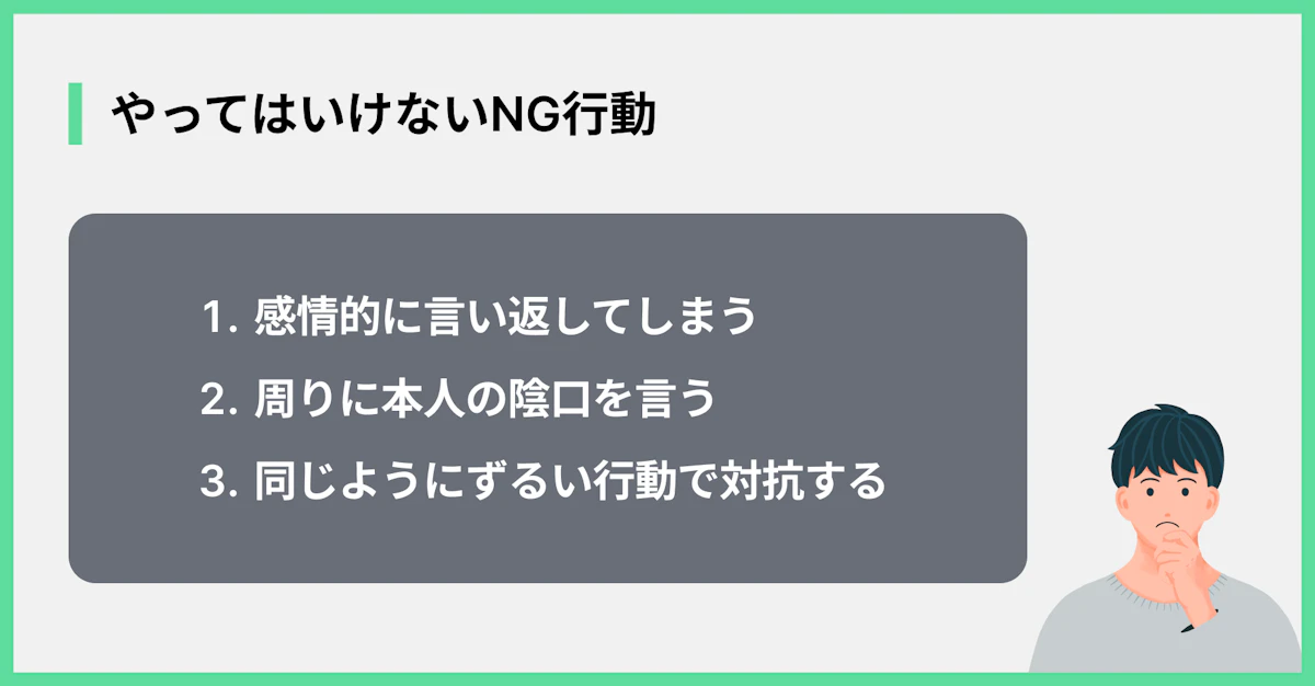 「やられたらやり返す」という気持ちで、相手と同じようにずるい行動で対抗するのは絶対にやめましょう。あなたも「ずるい人」の仲間入りをしてしまい、周りからの信用を失ってしまいます。
